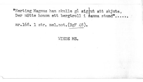 //// "Herting Magnus han skulle gå sig ut att skjuta, //// Der mötte honom ett bergtroll i åamma stund"...... //// nr.168. 1 str. mel.not.(DgF 48). //// VOEEDE MS. //// _____;______ ////