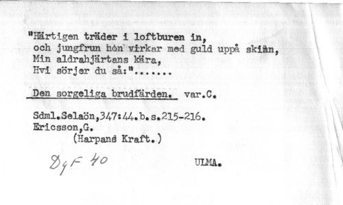 //// "Härtigen trader i loftburen in, //// och jungfrun hén virkar med guld uppa skiån, //// Min aldrahjärtans kära^ //// Hvi sörjer du så:^..,.... //// Den sorgeliKa brudfärden, var.C. //// Sdml. Selaön ,347:b. s. 215-216. //// Ericsson,G. //// (Harpanå Kraft.) //// ! ^ ////