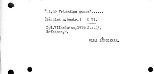 //// "Hiyho frimodiga gosse^...... //// ' - //// (Sånglek m.beskr.) D 71. //// LpltVilhelmina,2939:2.s.23. //// Eriksson,N. //// i UniA SÅNGLEKAR. ////