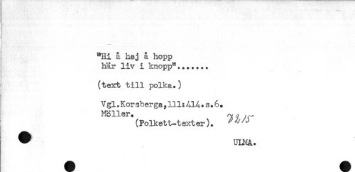 //// A //// T //// —— * //// "Hi å hej å hopp //// här liv i knopp"....... //// (texrt till polka.) //// t //// ) //// Vgl. Kor sberga,111:414.s.6. //// Möller. //// (Polkett^texter). ^ ^^ ////