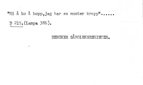 //// "Hi å ho å hopp,jag har en munter kropp"...... //// - < //// - //// D 215.(Lampa 386). //// DENCKER SANGLEKSREGISTER. //// ! ////