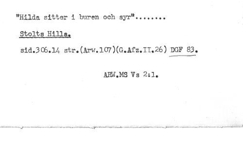 //// "Hilda sitter i buren och syr"........ //// Stolts Hilla. //// sid.306.1A str.(Arw.l07)(G.Afz.II.26) DGF 83. //// AEW.MS Vs 2:1. ////