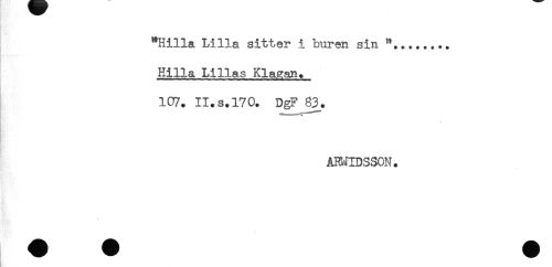 //// "Hilla H.lla sitter i buren sin //// Hilla Lillas Klagan* //// 1C7. II. s. 170. DgF 83. //// ABNIDSSON. ////