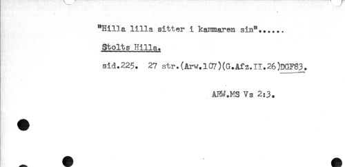 //// "Hilla lilla sitter i kammaren sin"...... //// Stolts Hilla. //// sid.225. 27 str.(Arw.lC7)(G.Afz.II.26)DGF83. //// t //// AHW.MS Vs 2:3. ////