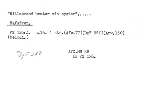 //// "Hillebrand hemtar sin syster",..... //// Hafsfrun. //// VS 126:4. s.36. 1 str.(Afz.77)(DgF 330)(Arw.l50) //// (Melodi.) //// ^ - AFZ.MS KB //// ^ KB VS 126. ////