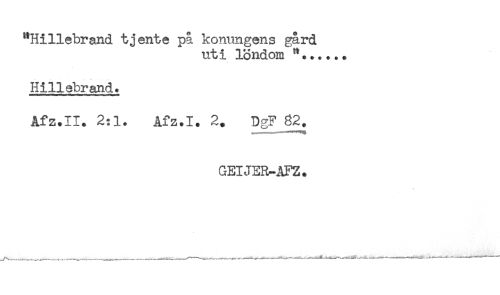 //// "Hillebrand tjente på konungens gård //// uti löndom "...... //// Hillebrand. //// Afz.II. 2:1. Afz.I. 2. Dg? 82. //// GEIJER-AFZ. ////