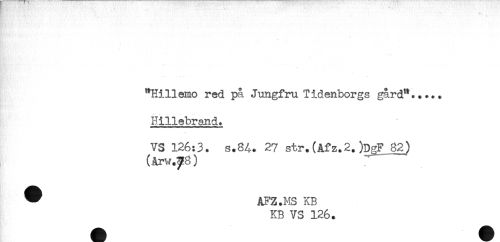 //// "Hillemo red på Jungfru Tidenborgs gård"..... //// Hillebrand. //// VS 126:3. s.8A. 27 str.(Afz.2.)DgL82) //// (Arw.^8) //// ^ AFZ.MS KB //// KB VS 126. ////