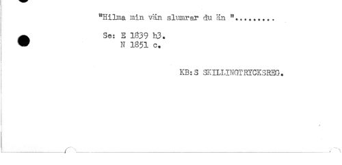 //// "Hilma min vän slumrar du än "......... //// ^ Se: E 1839 h3. //// W N 1851 c. //// KB:S SKILLINGTRYCKSREG. //// < //// ______ / - _____ ////
