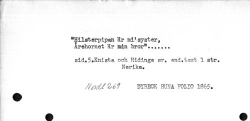 //// t < //// f //// K //// ' //// "Hilsterpipan är mi^ syster^ //// Arehornet är min bror"....... //// . //// sid*5*Knista och Hidinge sr. end.text 1 str. //// Nerike. //// DYBECK RUNA FOUO 1365. ////