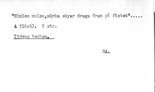 //// "Himlen mulen,mörka skyar draga fram på fästet"..... //// A 516:63. 5 str. //// Tidens tecken. //// Rå. ////