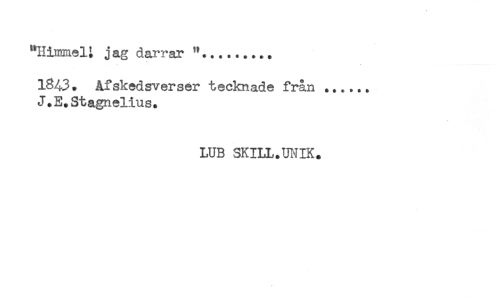 //// "Hiimneli jag darrar "......... //// - — - - ^ //// 1843. Afskedsversér tecknade från ...... //// J.E.Stagnelius. //// LUB SKILL.UMIK. ////
