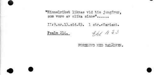//// "Himmelriket liknas vid tio jungfrur, //// som voro av olika sinne"...... //// 11:9.nr.13.sid.83. 1 str.+Variant. //// - //// Psalm 214. ^ ^ ^ //// FORSLUND MED DALÄLVEN. ////