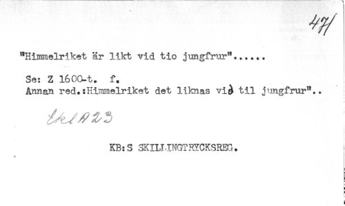 //// ^Himmelriket är lil(t vid tio jungfrur"*..... //// Se: Z 1600-t. f. //// Annan red.:Himmelriket det liknas vi^ til jungfrur".. //// ! //// KB:S 3KILT.INGTRYCK3REG. //// L //// c ////