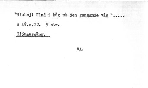 //// "Hioheji Glad i håg på den gungande våg ** + .... //// B AR.s.lO. 5 str. //// Sjomanssånp;. //// RA. ////