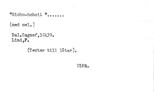 //// "Hioho-hohoH "....... //// (med mel.) //// Dal.Gagnef,10439. //// Lind,P. //// (Texter till låtar). //// ULMA. //// f ////