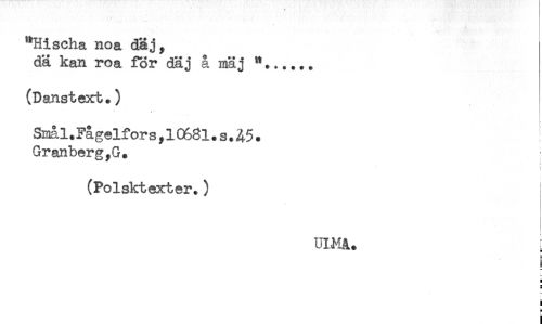 //// t*Hischa noa däj, //// dä kan roa for däj å mäj "...... //// (Danstext.) //// Snål .Fågelfor s, 10681. s. 45. //// Granberg,G. //// (Polsktexter.) //// * i //// UIMA. //// 5 //// H //// * ////