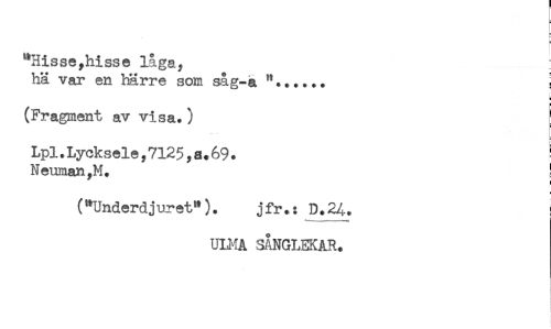 //// r- //// **3isse,hisse låga, //// hä var en härre som såg-a //// 5 //// (Fragment av visa.) //// Lpl.Lycksele,7125,a.69. ! //// Neuman,M. ! //// ("Underdjuret"). jfr.: D.24. //// uniA SÅNGLEKAR. ////