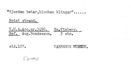//// Roini strand. //// V.M.A.Acc.nr.3492. Sn.Vinber^. //// Ref. Aug.Bondesson. 3 str. //// sid.127. VARBERRS MUSEUM. //// f ////