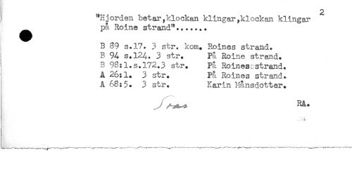 //// t* 2 //// "Hjorden betar,klockan klingar,klockan klingar //// __på Roine strand"....... //// B 89 s.17* 3 str. kom. Roines strand. //// B 94 s.124. 3 str. På Roine strand. //// B 98:l.s.172.3 str. På Roinesrstrand. //// A 26:1. 3 str. På Roines strand. //// A 68:5. 3 str. Karin Månsdotter. //// !] //// ; ////