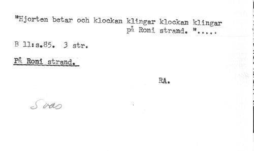 //// "Hjorten betar och klockan klingar klockan klingar ! //// på Roni strand. "..........i //// t //// B ll:s.85. 3 str. < //// i //// t //// På Roni strand/ ! //// = //// RA. ; //// E //// i //// t ////