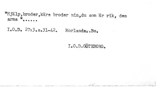 //// "Hjälp,broder,käre broder min,du som är rik, den //// arma //// I.O.D. 27:3.s.3l-A2. Morlanda..Bo. //// I.O.D.GCTEBORG. ////