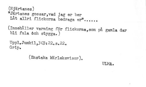 //// ! //// (Hjärtanes) //// "Järtanes gossar,vad jag er ber //// Lat allri flickorna bedraga er"...... //// (Innehåller varning för flickorna,som på gamla dar //// bli fula Ach stygga.) //// Uppl.Jumkil,3 03:22.s.22. //// Grip. //// (Enstaka kärleksvisor). //// ULMA. ////