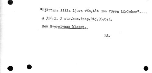 //// "Hjärtans lilla ljuva vän,Lat den förra kärleken".... //// A 352:1. 3 str.kom.insp.Rtj.9695:4. //// . //// Den^övergivnas klagan. //// RÅ. //// ! ////