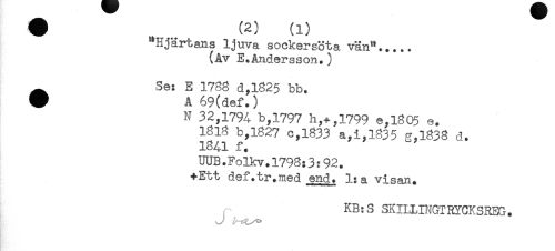 //// "Hjärtans ljuva sockersöta vän"..... //// (Av E.Andersson.) //// ^ Se: E 1788 d,l825 bb. //// ^ A 69(def.) //// N 32,1794 b,1797 h,^,1799 e,l805 e. //// 1818 b,1827 c,l833 a,i,1835 g,1838 d. //// 1841 f. //// UUB.Folkv.l798:3:92. //// +Ett def.tr.med end. l:a visan. //// KB:S SKILUNGTRYCKSREG. //// J' ////
