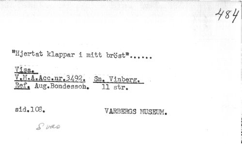 //// "Hjertat klappar i mitt bröst"...... //// i //// ' ' //// Visa. //// V.M.A.Acc.nr.3A92. Sn. Vinberp;. ! //// Ref. Aug.Bondessoh. 11 str. //// sid. 108. VARBERGS HUSEUI^. //// i //// a //// <r ^^ I //// B //// r ////