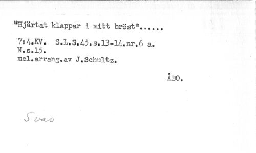 //// "Hjärtat klappar 1 mitt bröst"...... //// ..... //// 7:4.KV. S.L.S.45.s.l3-lA.nr.6 a. //// N.s.15. //// mel.arrajig.av J.Schultz. //// ÅBO. ////