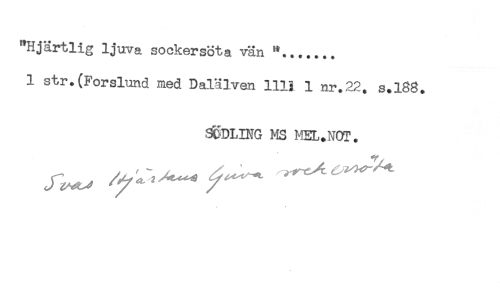 //// "Hjärtlig ljuva sockersöta vän "....... //// 1 str.(Forslund med Dalälven 11H 1 nr.22. s.188. //// ÄDLING MS MEL.NOT. //// t ////