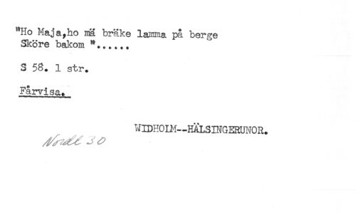 //// "Ho Maja,ho ma bräke lamma på berge //// Sköre bakom "...... //// S 58. 1 str. //// Fårvisa. //// IJIDHO Ui—HALSINGERUNO R. ////