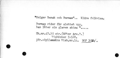 //// ; "Holger Dansk och Burman"., äldre folkvisa. //// Burman rider för slottet upp, //// han låter sin glaven skina "..... //// Ek.nr.47.30 str.(Efter Arw.7.) //// Visböcker 1:126. //// jfr.:Gyllenmärs Visb.nr.14. DGF 3CEk/. //// ? //// H ////