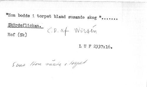 //// "Hon bodde i torpet bland susande skog "....... //// Skör defH ekan. ^ //// Hof (Sk) ! //// L U F 2337:16. ////