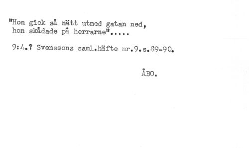 //// "Hon gick så nätt utmed gatan ned, //// hon skådade på herrame"..... //// 9:4.? Svenssons saml.häfte nr.9.s.89-90. //// ÅBO. ////