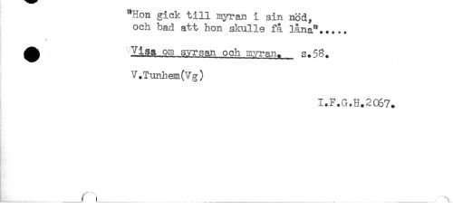 //// "Hon gick till myran i sin nöd, //// och bad att hon skulle få låna"..... //// - //// ... //// Visa om syrsan och rnrran^ s.58. //// V.Timhem(Vg) //// I.F.G.H.2067. //// -___ ______f !........ ......... ... ////