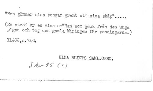 //// "Hon gömmer sina pengar grant uti sina skåp"..... //// (En strof ur en visa om"Han som geck från den un<?a //// Pigan och tog den gamla käringen för penningarna.) //// 11482,s.740. //// UUfA BLIXTS SAML.03SC. //// J ^ ^ ^ //// v.'—v-Y—*-^—<-.- —-----*-----, __—- ______, ^^ JU.. ' —- ////