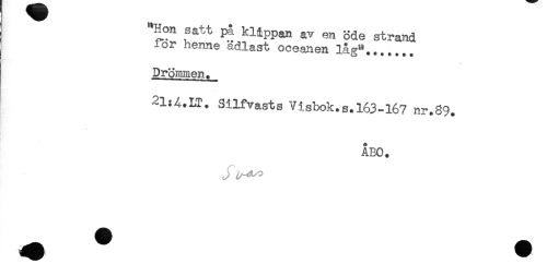 //// "Hon satt på klippan av en öde strand //// i or henne ädlast oceanen låg",...... //// Drömmen. //// ! //// 21:A.LT. Silfvasts Visbok.s.163-167 nr.89. //// ÅBO. ////