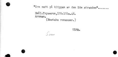 //// "Hon satt på klippan av den öde stranden*....... //// Små 1 .T r y s erum,175:172s.48. //// Arnman. //// (Enstaka romanser.) //// ULMA. //// } J (/du^ //// - ////