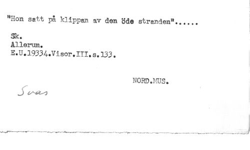 //// "Hon satt pa klippan av den öde stranden"______ //// i //// Sk. //// Allerum. //// E.U.19334.Visor.III.s.133. //// < //// NORD.MUS. //// i //// . ---^---— ------.-----_-------.----/ ////