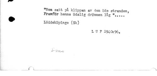//// "Hon satt pa klippan av den öde stranden. //// Framför henne ödslig dröRmen låg "+.... //// Löddeköpinge (Sk) //// L U F 2940:96. ////