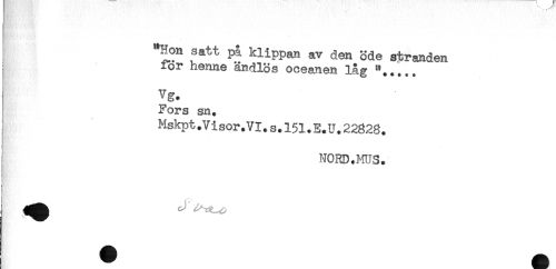 //// "Hon satt på klippan av den öde stranden //// ior henne ändlös oceanen låg //// Vg. //// Fors sn. //// Mskpt.Visor.VI.s.l51.E.U.22828. //// NORDJ€IS. ////