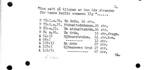 //// ^^ 2 //// "Hon satt på klippan av den öde stranden * //// for henne ändlös oceanen låg "...... //// B 73:l.s.76. En dröm. 16 str. //// B 73:2.s.35. Midnattsdrömmen.26 str. //// B 83:s.33. En midnattsdröm.26 str. //// B 84 s.26. En dröm. 15 str.fragm. //// A 68^2 Sjomansbruden. 24 str.kom. //// A 105:13 En dröm ' 27 strj //// A 107:5 Sjömannens brud 27 str. //// A ^'74 ........... 27 str. //// RA. //// o' //// _ t ^^ ^^ ////