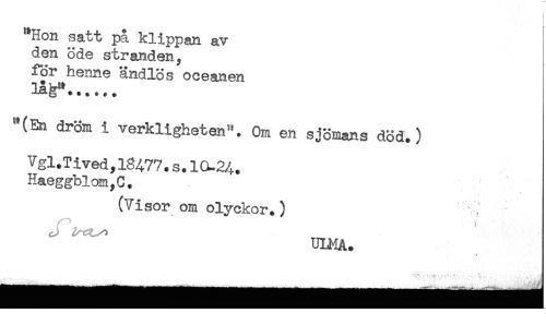 //// "Hon satt på klippan av //// den öde stranden, //// för henne ändlös oceanen //// låg"...... //// "(En dröm i verkligheten". Om en sjömans död.) //// Vgl.Tived, 18^77. s. IO.24. //// Haeggblom,C. //// (Visor om olyckor.) //// o) ^TCt^ //// ULMA. ////