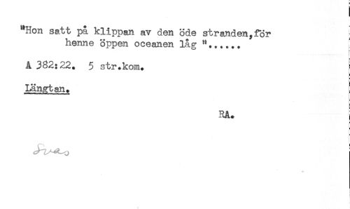 //// "Hon satt på klippan av den öde stranden,för //// henne öppen oceanen låg .. //// A 382:22. 5 str.kom. //// Längtan. //// RA. j //// * //// i ////