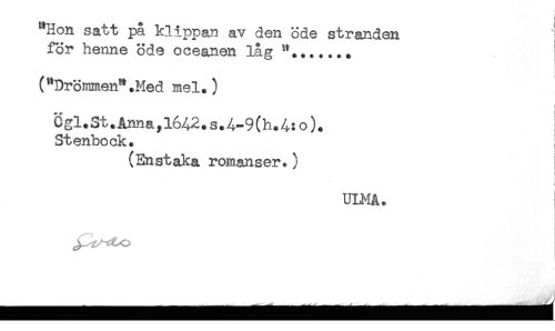 //// ^Hon satt på klippan av den öde stranden //// för henne öde oceanen låg //// ("Drömmen".Med mel.) //// i //// Ögl.St.Anna^l642.s.4-9(h^:o). //// Stenbock. ! //// (Enstaka romanser.) //// r //// i //// ULMA. //// ^^o ! ////