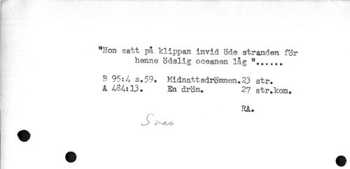 //// "Hon satt på klippan invid öde stranden för //// henne ödslig oceanen låg "...... //// B 95:4 s.59. Midnattsdröimnen.23 str. //// I A 484:13. En dröm. 27 str.kom. //// T //// y * //// ; Rå. ////