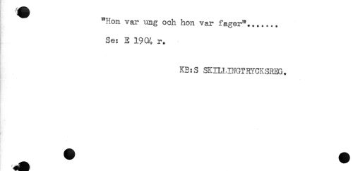 //// "Hon var ung och hon var fager"....... //// Se: E 1904 r. //// < //// KB:S SKILLINGTRYCKSREG. //// * ////