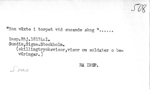 //// "Hon växte i torpet vid susande skog //// insp.Rtj.18174:1. //// Sundin,Signe.StocMiolm. //// (skillingtrycksvisor,visor om soldater o be- //// väringår.) //// Rå INSP. //// t //// i ////