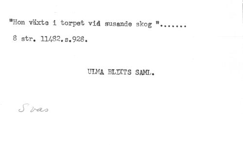 //// "Hon växte i torpet vid susande skog //// 8 str. 11482,s.928. //// UINA BLIXTS SAM,. //// J ////